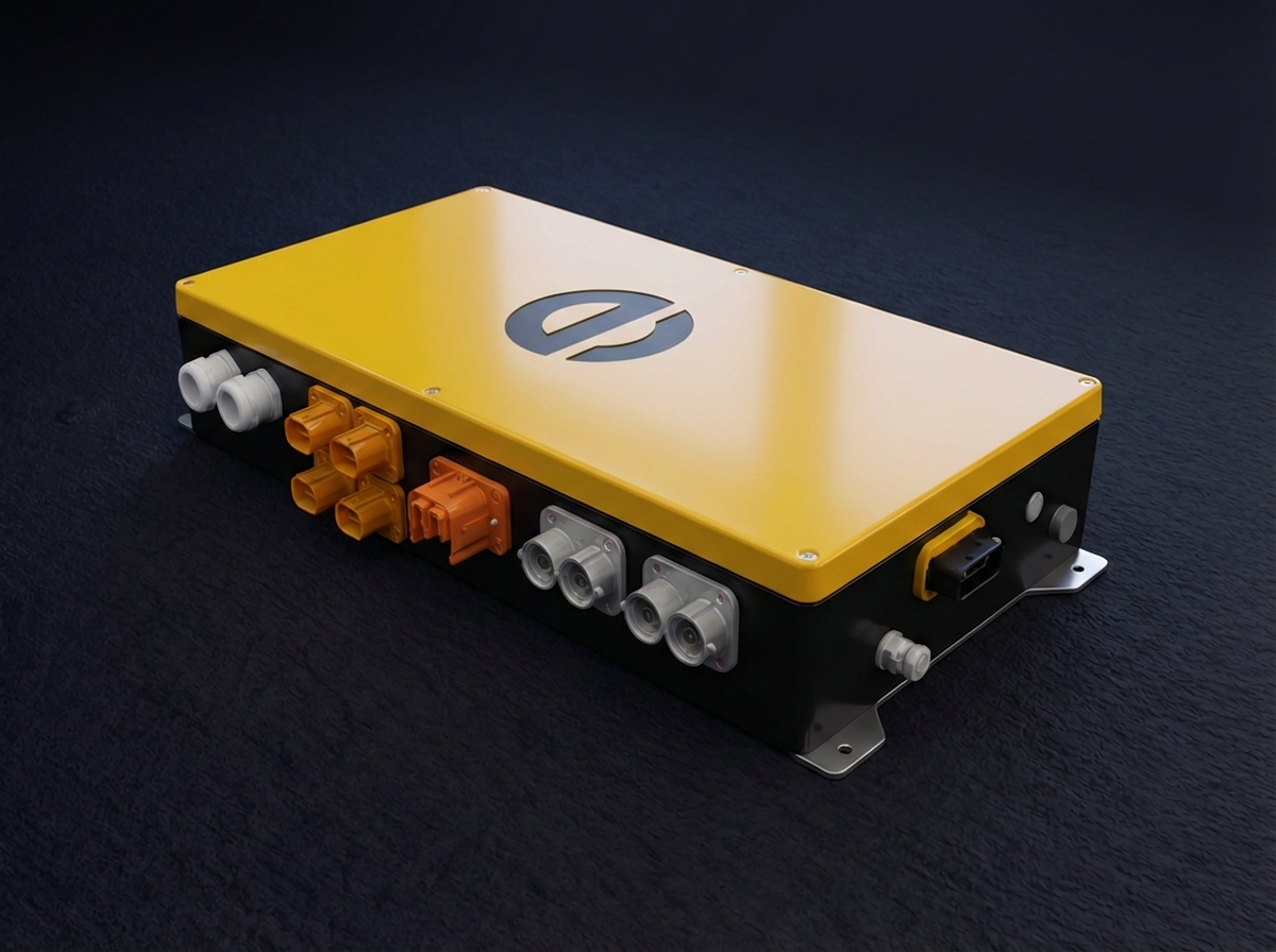 Gelbes und schwarzes Power-Distribution-Modul PDU L38A mit mehreren Hochstrom-Anschlussports und robustem Gussgehäuse. Ansicht von unten, Frosch-Perspektive